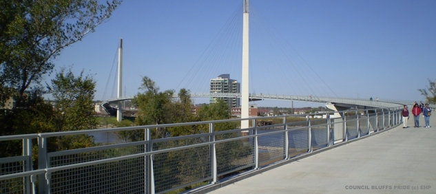 Pictured above: The sculptural suspension footbridge built in 2008 over the Missouri River brings visitors to Council Bluffs.